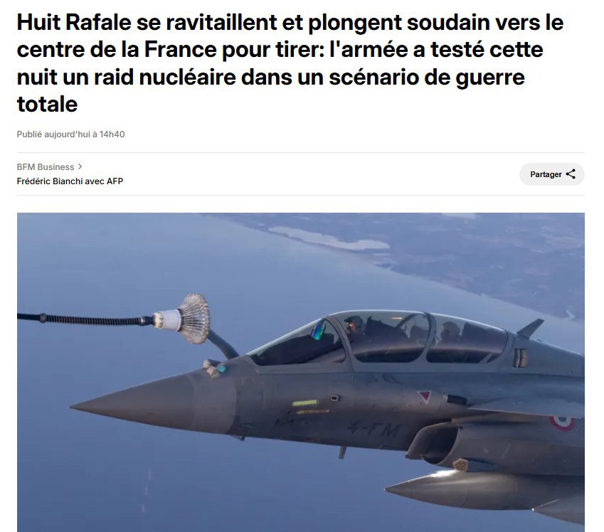 ‘В течение ночи над значительной частью французской территории были переброшены сорок истребителей Rafale, Mirage 2000, радиолокационных самолетов AWAC и самолетов-заправщиков A330 MRTT для осуществления имитации ядерного налета.