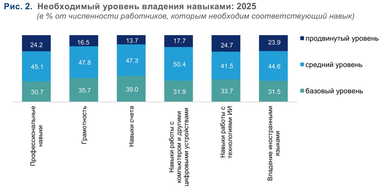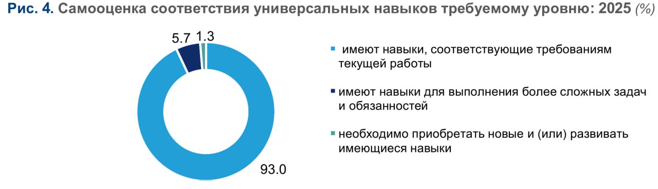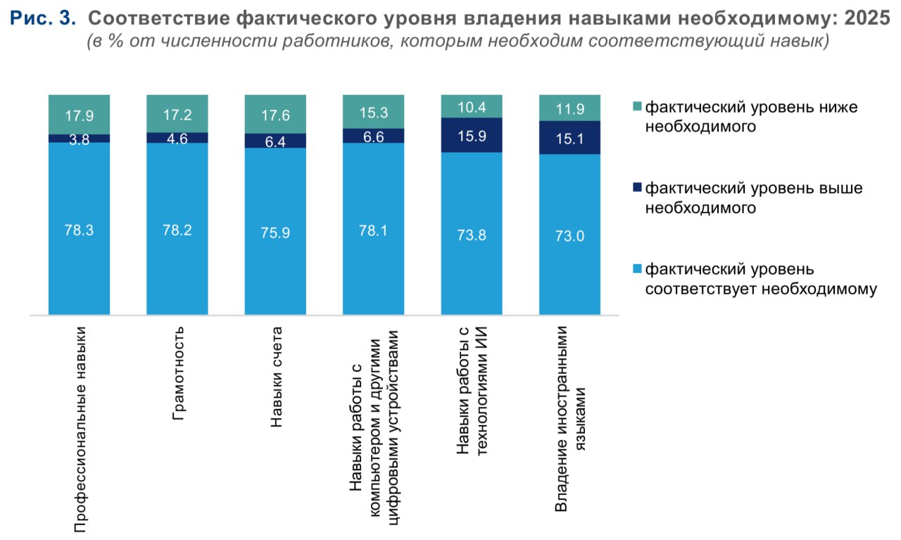 По результатам исследования, в реальности >70% опрошенных занятых россиян обладают отдельными навыками на уровне, соответствующем требованиям занимаемых ими рабочих мест.