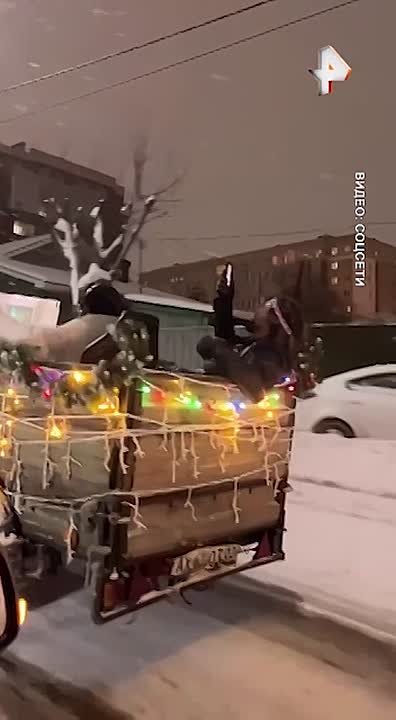 Затейники, нарядившись в шубу и костюм индейца, прикрепили к машине прицеп, в котором устроили настоящий новогодний компьютерный клуб. Все происходящее они сами фиксировали на камеру.