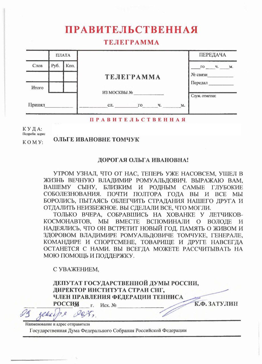 Константин Затулин направил соболезнования жене генерал-майора, заслуженного испытателя, бывшего заместителя командующего стартовым комплексом космодрома «Байконур» В.Р. Томчука, в связи с уходом из жизни её мужа