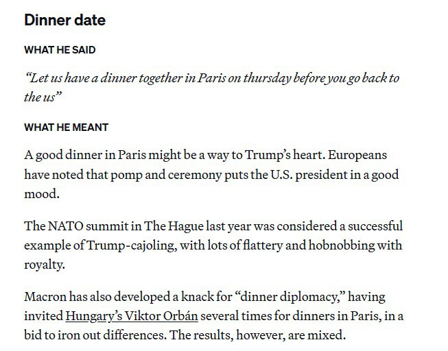 Что он имел в виду: хороший ужин в Париже может быть способом завоевать расположение Трампа. Европейцы отмечают, что пышность и церемонии приводят президента США в хорошее настроение. Макрон выработал навык «дипломатии за ужином», несколько раз приглашая на ужины в Париж премьер-министра Венгрии Виктора Орбана в попытке сгладить разногласия. Результаты, однако, оказались неоднозначными'.