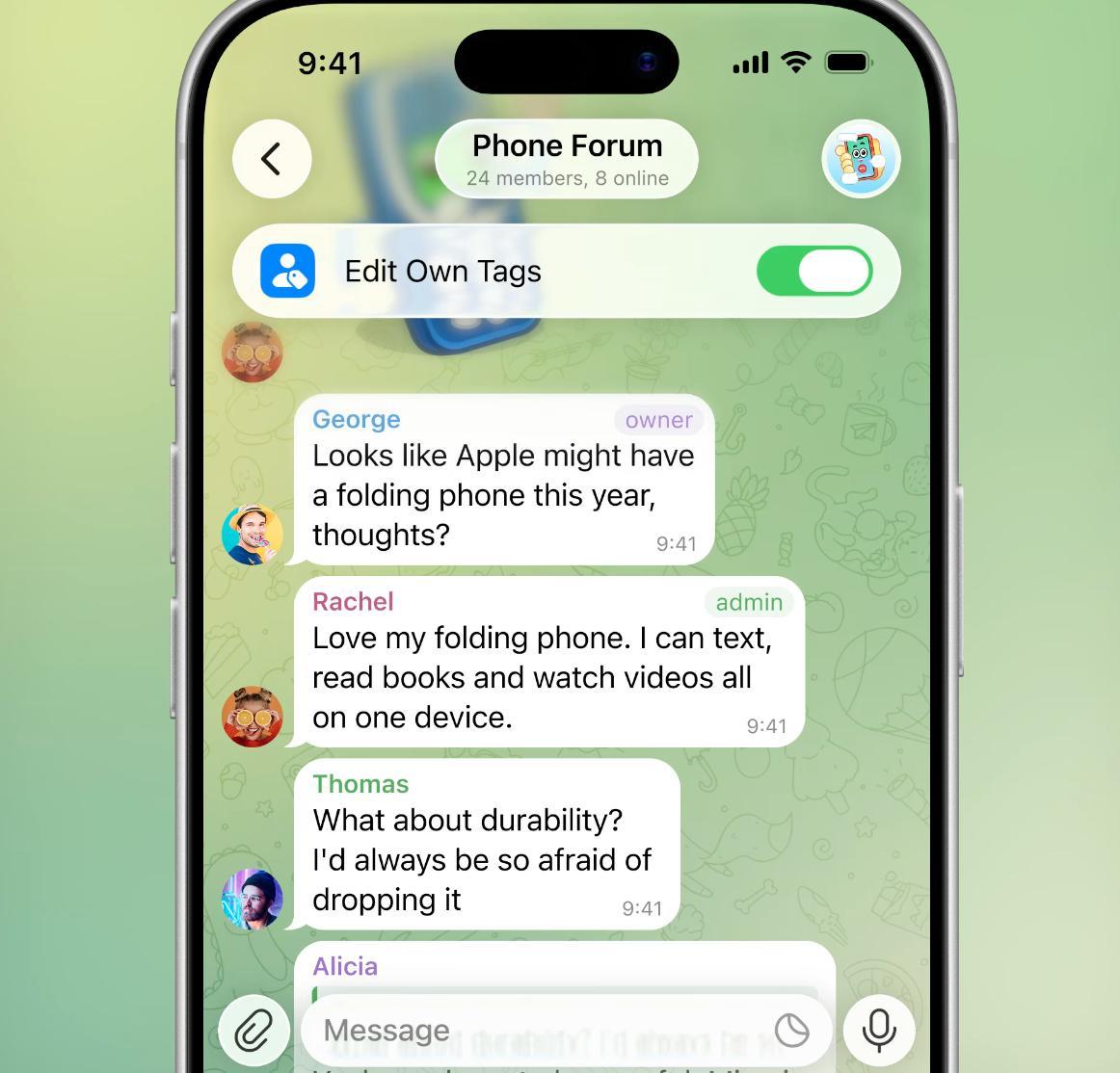 участники групповых чатов могут добавить рядом со своим именем тег, например должность в команде, специальность в университете или другие данные. Администраторы могут управлять редактированием тегов, а их собственные отметки выделяются цветом;
