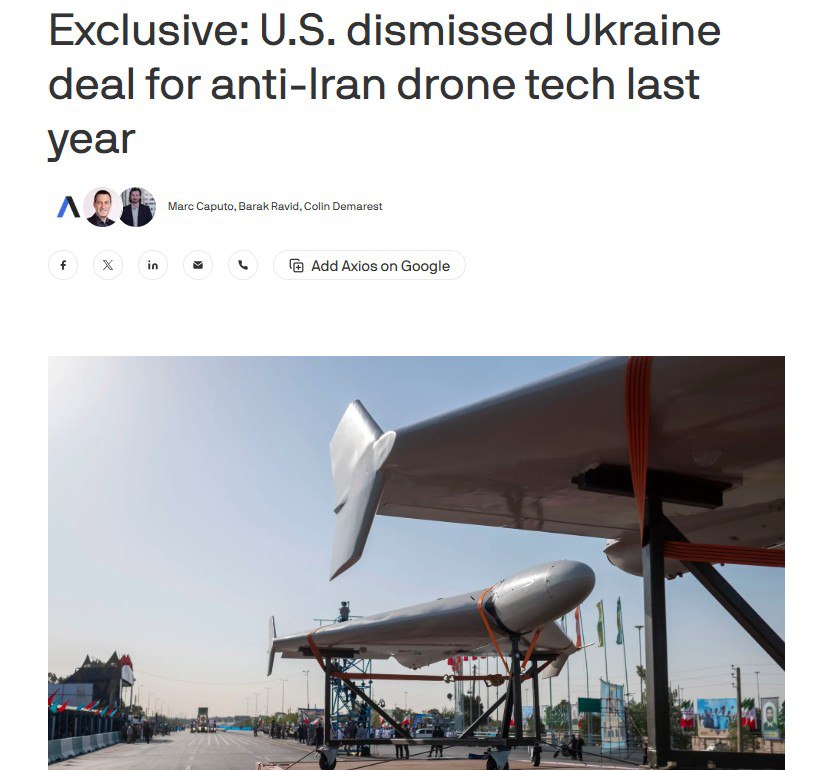 ‘На закрытой встрече в Белом доме 18 августа президент Украины Владимир Зеленский предложил дроны-перехватчики президенту Трампу. Украинцы подготовили презентацию PowerPoint. Она включала идею создания ‘боевых хабов для дронов’ в Турции, Иордании и государствах Персидского залива, где расположены американские базы, чтобы противостоять угрозе со стороны Ирана и его прокси. ‘На той встрече… в августе Трамп попросил свою команду заняться этим, но они ничего не сделали’, — отметил украинский чиновник.